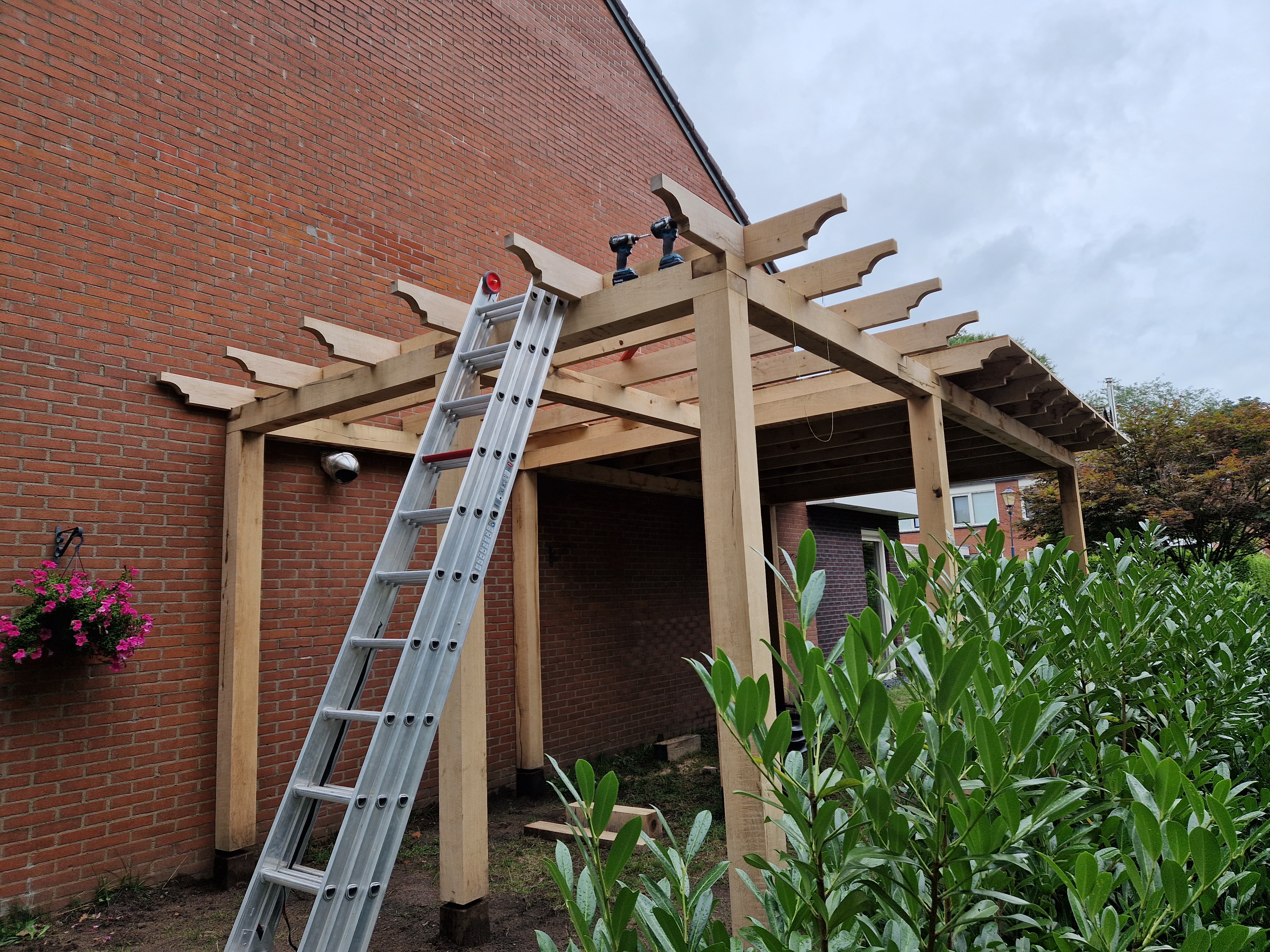 Met trots kijken we terug op een recent afgerond project: het plaatsen van een schitterende, robuuste eiken overkapping voor een van onze gewaardeerde klanten. Dit project is een prachtig voorbeeld van vakmanschap en aandacht voor detail, waarbij traditionele materialen worden gecombineerd met moderne afwerkingstechnieken om een tijdloze buitenruimte te creƫren.
